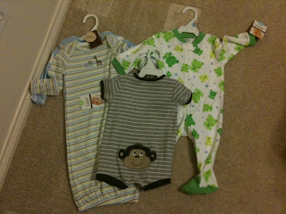 These are gifts from Carrie, a friend of mine at work. We plan on doing his room in Monkeys, and she's a HUGE fan of frogs so she couldn't not get him something with frogs on it :)